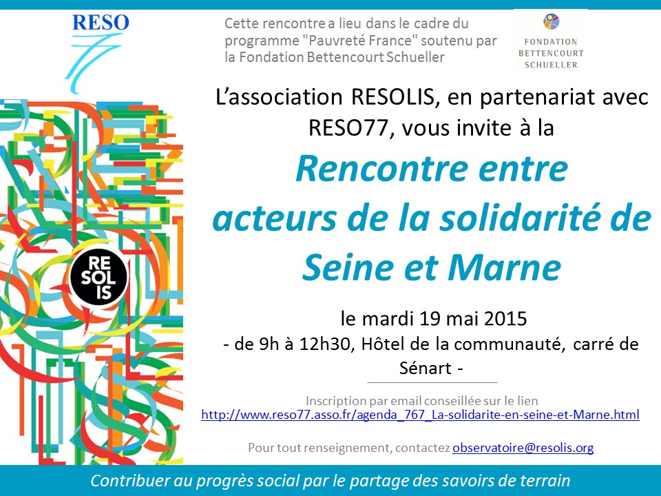 RESOLIS, en partenariat avec RESO77, organise le mardi 19 mai prochain une Rencontre entre acteurs de la solidarité en Seine et Marne. Cette Rencontre, ouverte à tous, s’inscrit dans son programme « Pauvreté France » soutenu par la Fondation Bettencourt Schuller.