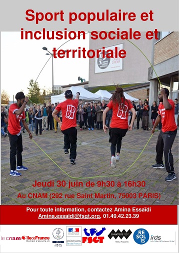 Le Chantier Milieux Populaires de la FSGT (Fédération Sportive et Gymnique du Travail) organise le 30 juin le séminaire « Sport populaire et inclusion sociale et territoriale. De la singularité des parcours aux actions collectives », en partenariat avec: le Cnam (Conservatoire national des arts et métiers), le Conseil Régional Ile-de-France, le CROSIF (Comité Régional Olympique et Sportif Ile-de-France), la DRJSCS Ile-de-France (Direction Régionale de la Jeunesse, des Sports et de la Cohésion Sociale), l’IRDS (Institut Régional de Développement du Sport), RESOLIS et les projets collectifs de Sciences Po Paris.